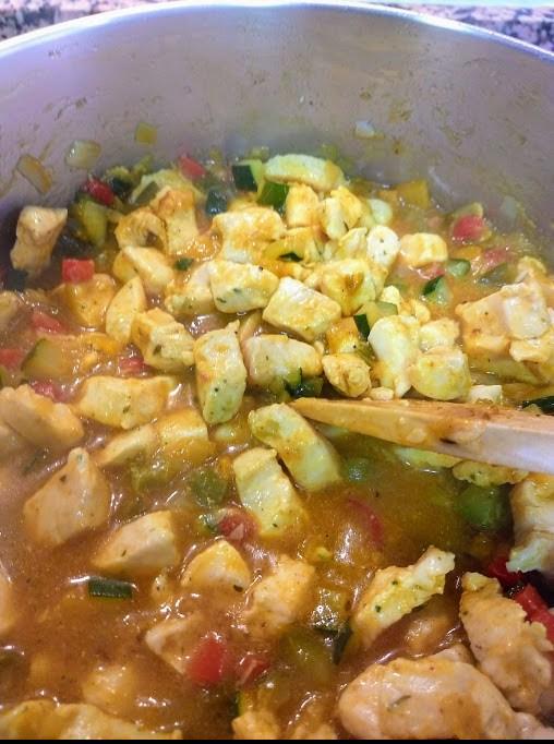 Cuando la cebolla y el pimiento ya casi esté, echad el calabacín y el pollo. Le dais unas vueltas y añadís las especias (no os volváis locos si os falta alguna, las imprescindibles son el curry, la pimienta negra molida y el cúrcuma). Ponéis un poco de caldo que cubra el conjunto y lo dejáis hervir unos 20 minutos o hasta que veáis que el pollo está tierno.