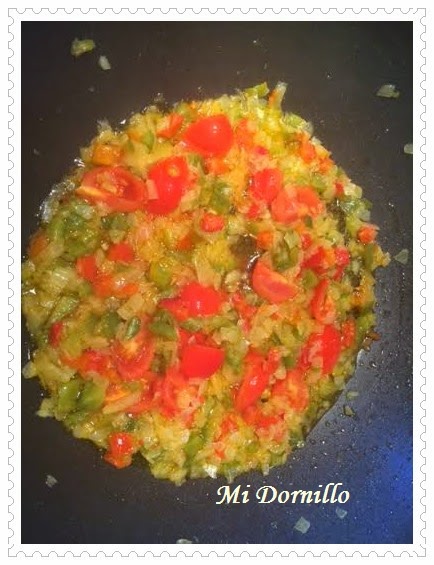En el mismo aceite ponemos el pimiento y la cebolla picada.