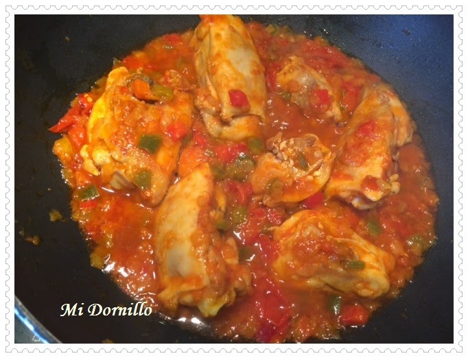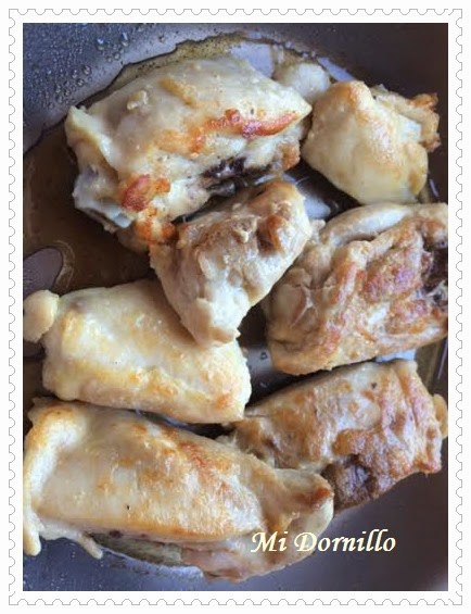 Cortamos y limpiamos de piel el pollo, lo doramos a fuego fuerte en el aceite.Cuando este lo sacamos y reservamos.