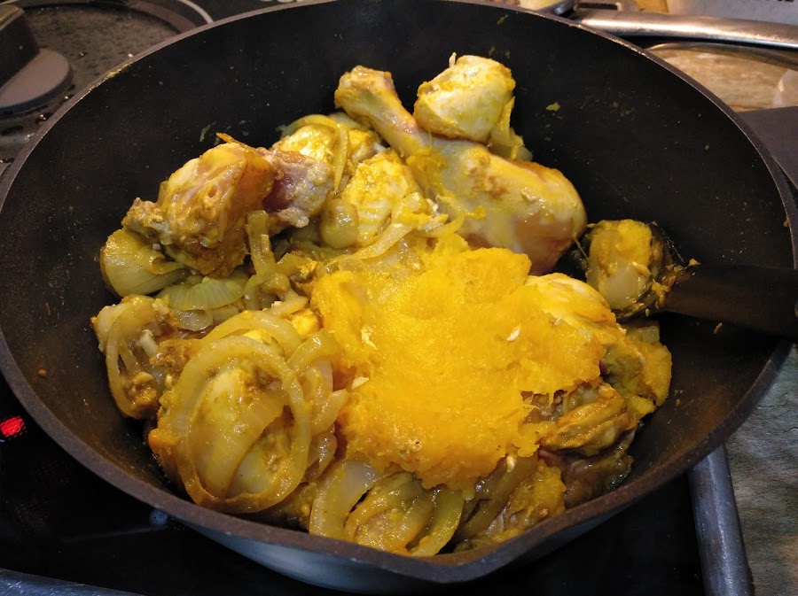 Echamos la calabaza, la leche de coco y el caldo que preparamos al principio (colado) hasta que la carne quede cubierta.
