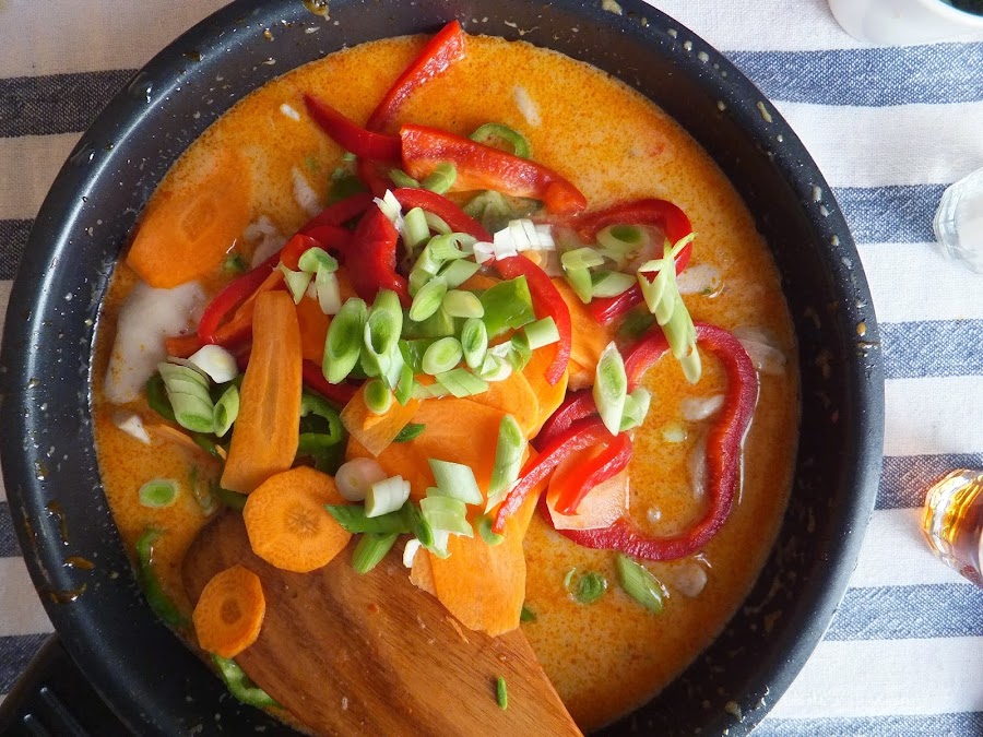 Pero mi defecto a veces, no siempre, suele tener grandes recompensas. Como cuando fuimos a Roma y gracias una intensa investigación y doscientos resoplidos de él, acabamos comiendo probablemente la pizza más extraña, y deliciosa, de Roma. O como en este plato que gracias a un encuentro "fortuito" con la pasta de curry rojo en la semana oriental del Lidl ahora soy un poco más feliz por saber lo fácil que puede llegar ser a hacer el mejor pollo al curry que haya hecho yo en mi vida. Y de verás que no miento. En mi vida. Es un plato facilísimo espectacular incluso para aquellos que no son muy amigos del curry. Es suave y sedoso gracias a la leche de coco, solo un poco picante, con un sabor muy peculiar al que la verdura añade muchísima frescura y el arroz lo convierte en un manjar.