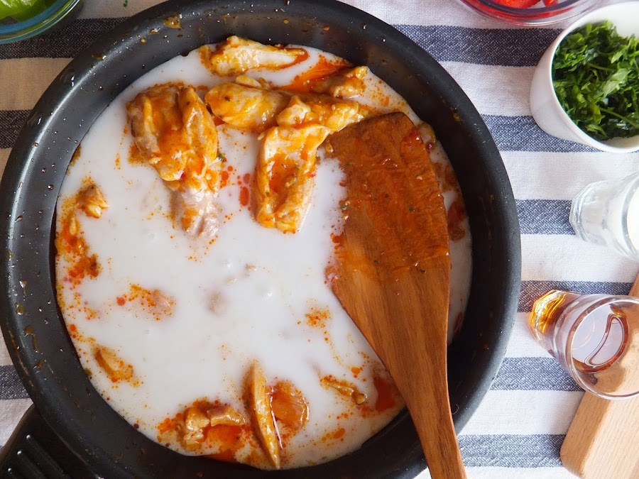 3. Añade el pollo remueve y cuando este a medio hacer añade la leche de coco. Cocina 3-4 minutos.