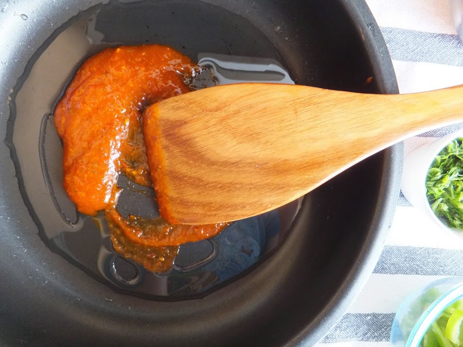2. Calienta aceite 2 cuchadas de aceite en el wok, o en su defecto, en una sartén antiadherente. Cuando este caliente echa la pasta de curry rojo y saltea dos tres minutos