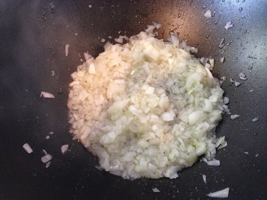 En primer lugar picaremos bien fina la cebolla o cebolleta. Picarla tan fina como os guste encontrarla después en el plato. Una vez picada la sofreímos en una sartén o wok con un poco de sal hasta que transparente.