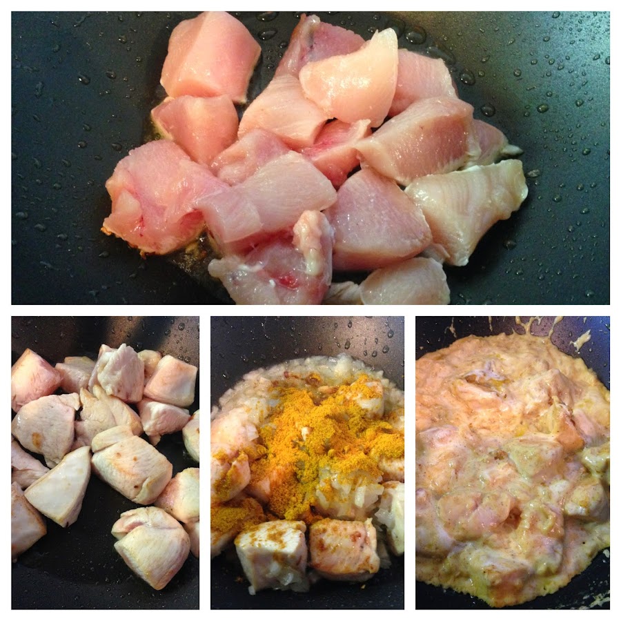 Troceamos el pollo en trozos no muy grandes y marcamos en la misma sartén que hemos pechado la cebolleta. Cuando el pollo esté marcado añadimos el curry y sofreímos un minuto más. Cuando se haya integrado añadimos la nata (crema de leche) o la leche de coco.