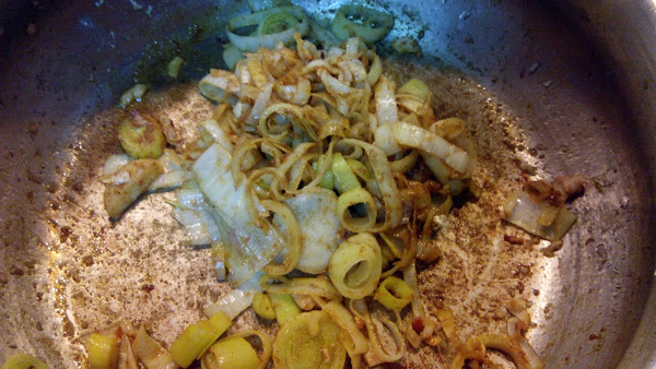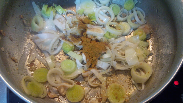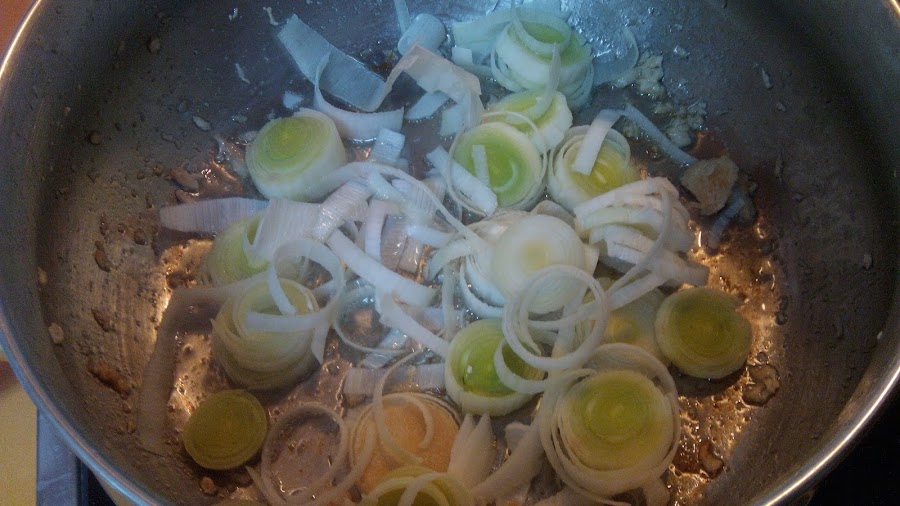 Cuando esté hecho sacamos y reservamos. En el mismo aceite sofreímos el puerro cortado a rodajitas.