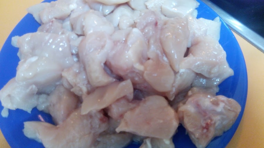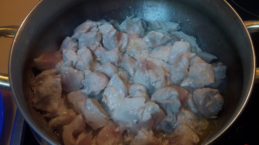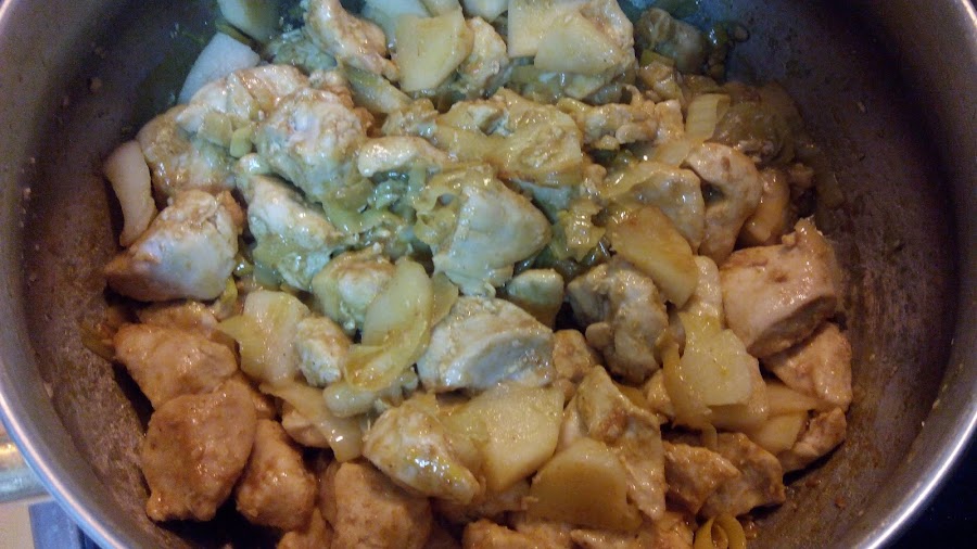 Añadimos el pollo a la cazuela. Y los gajos de manzana cortados por la mitad.