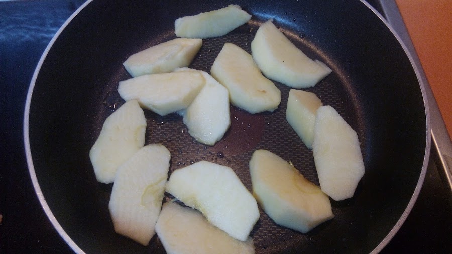 Dejamos cocer unos minutos y en una sartén vamos a freír la manzana cortada a gajos con un pelín de aceite.