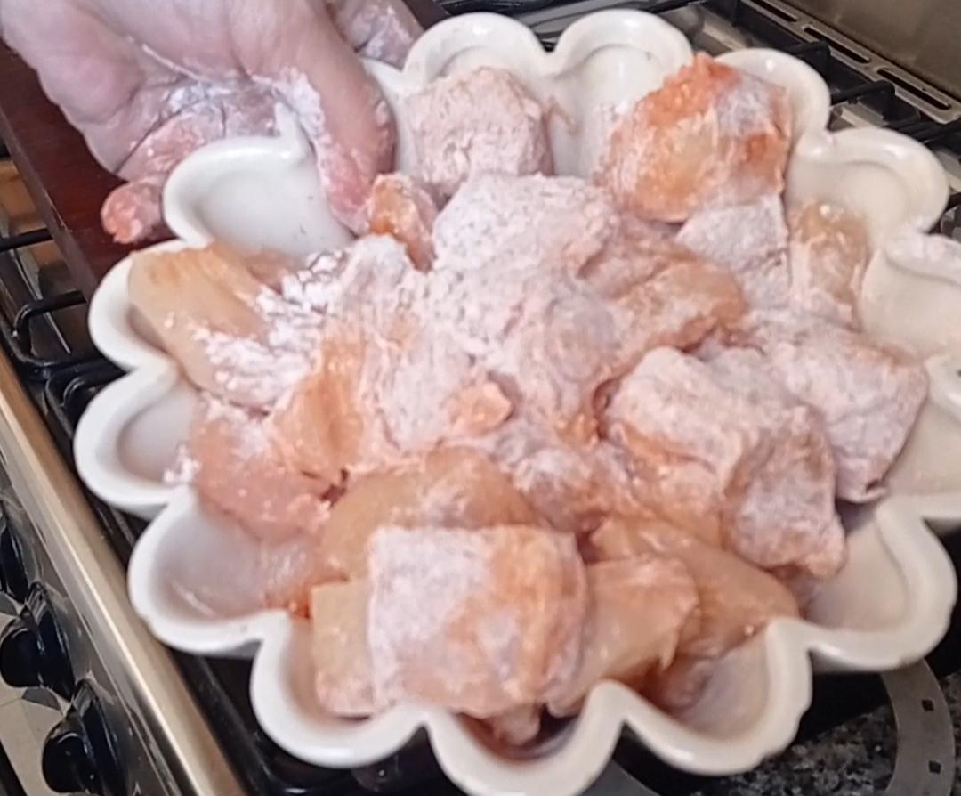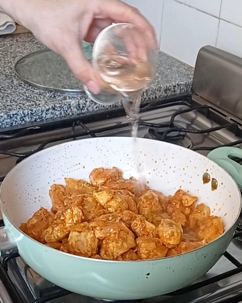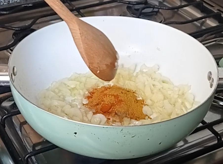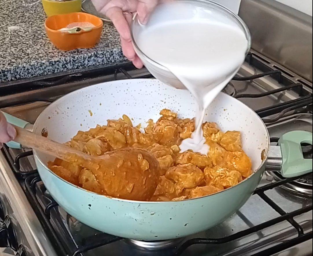 Cortamos las pechugas en cubos pequeños y mezclamos con harina y pimentónRehogamos en una sartén profunda o Wok, la cebolla con un poco de aceite y le sumamos el curry, el jengibre y el pimentón, y el garam masala, revolvemos para que no se queme.