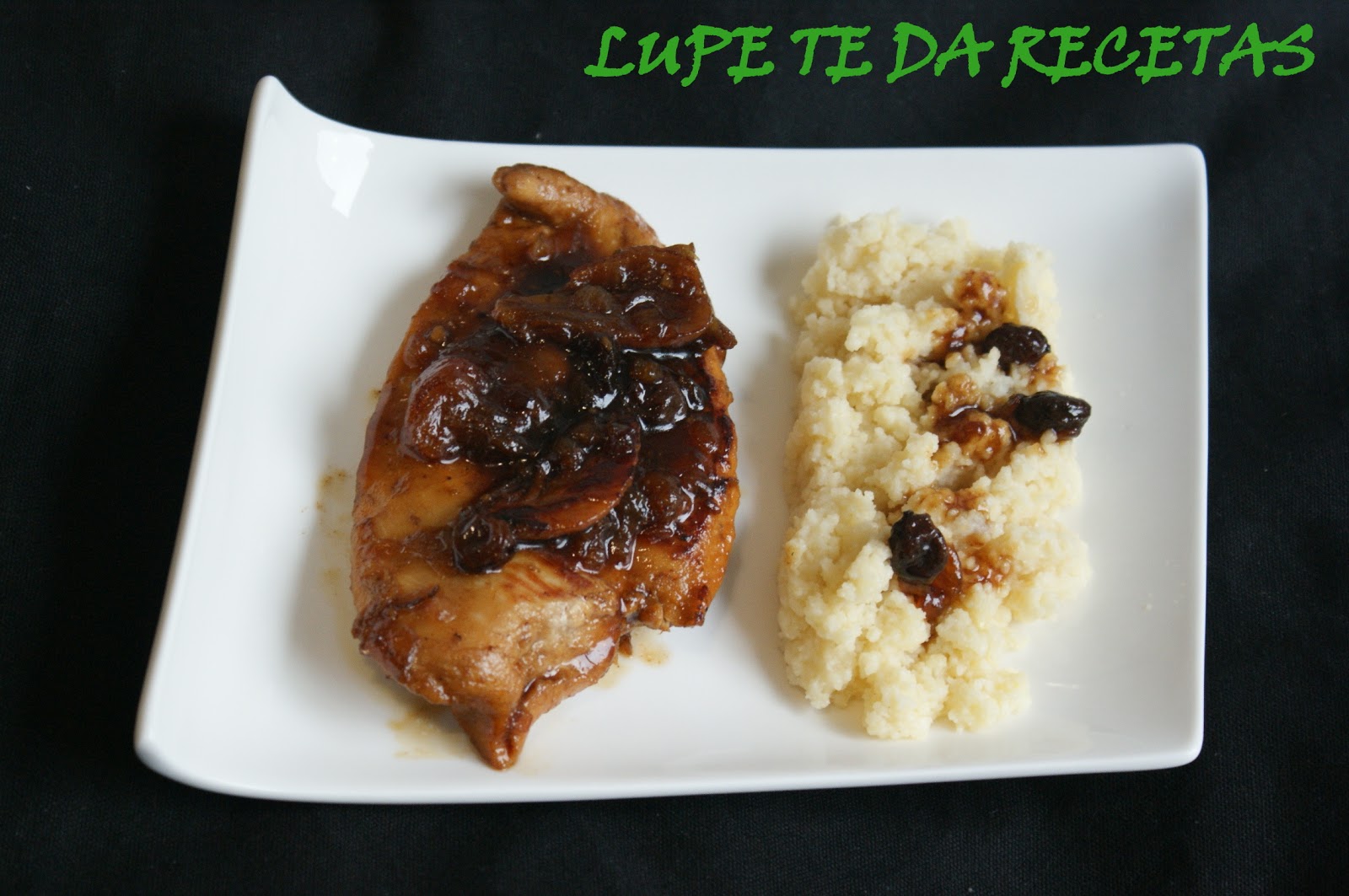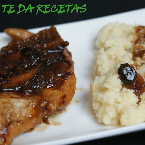 Por otro lado dorar por ambos lados las pechugas marinadas, añadir los 100 ml. De vino dulce moscatel o licor dulce elegido, remover y dejar evaporar, una vez doradas añadir a la cebolla pochada, a todo esto añadir también el agua con lasa pasas y los dátiles, la miel y dejar reducir a fuego medio, cuando espese reducir el fuego y acabar de hacer.