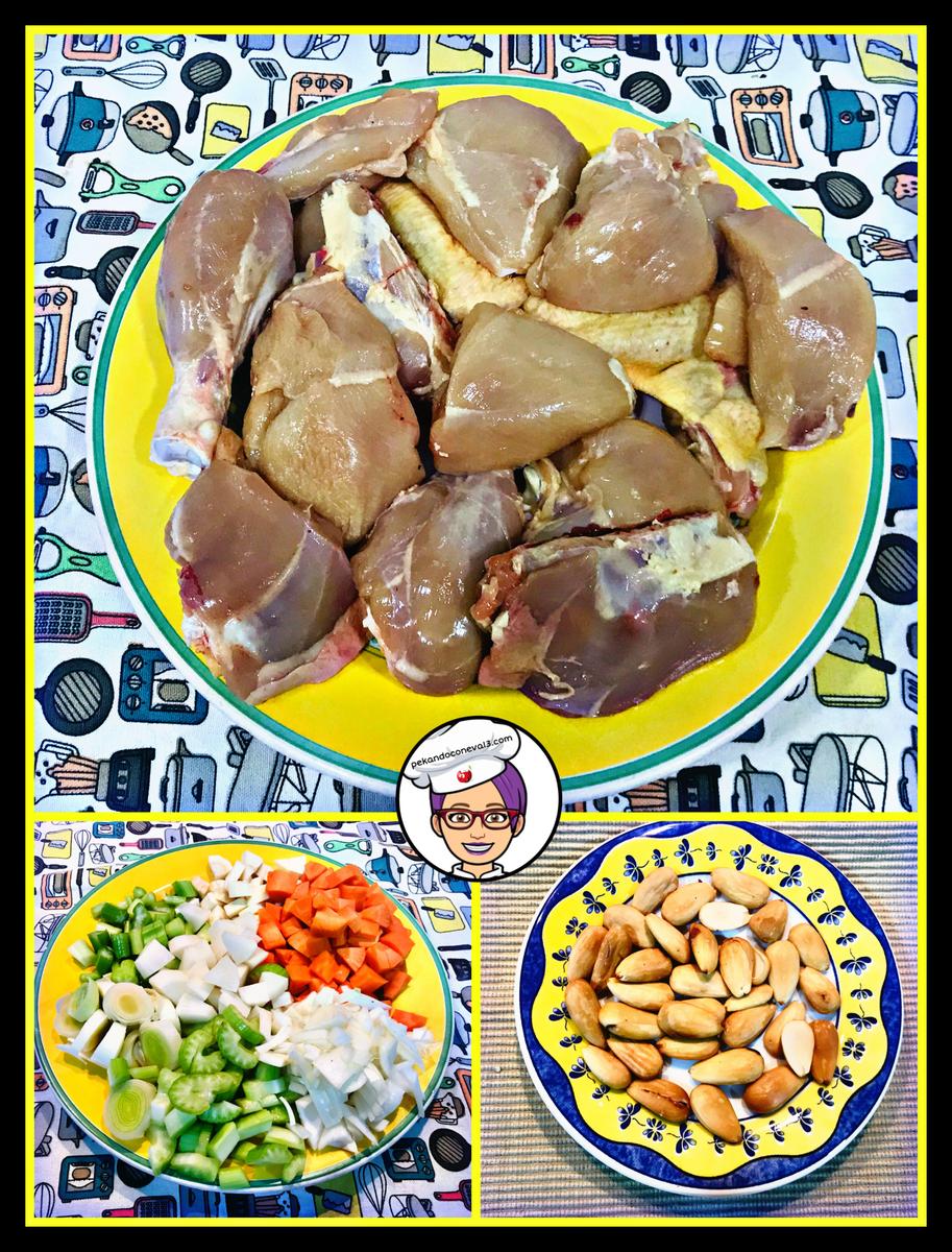 Trituras las verduras con el líquido que lleve y las almendras tostaditas, si quieres la salsa más fina la pasas por un chino, la mezclas con el pollo y a comerrrrrr