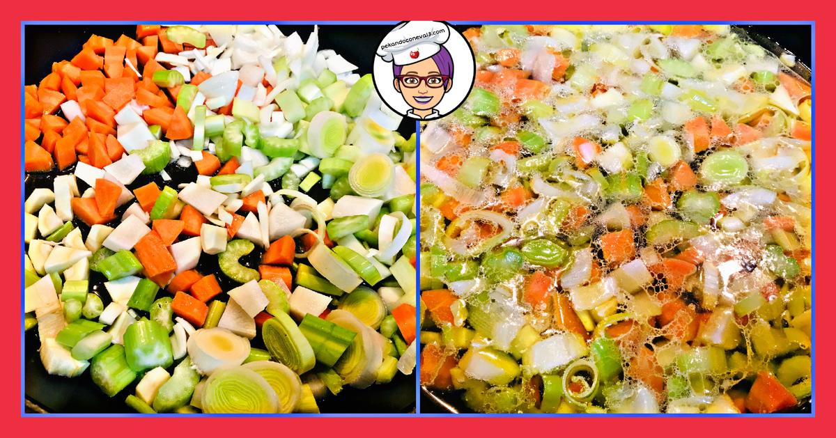 Mientras en una cazuela metemos ya lavadas y cortadas la cebolla, zanahoria, apio chirivía, nabo, puerro cuando este medio hecho le echamos mas o menos 500 ml de agua y que hierva unos 30 minutos.