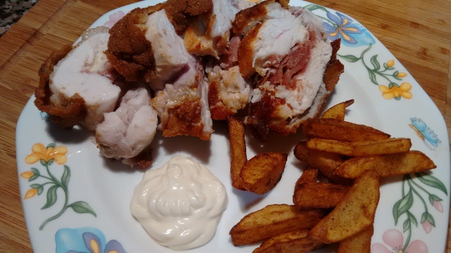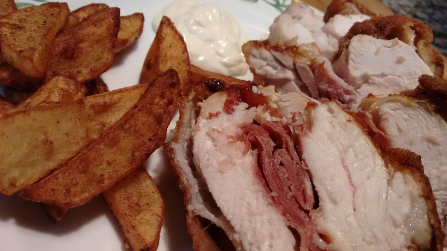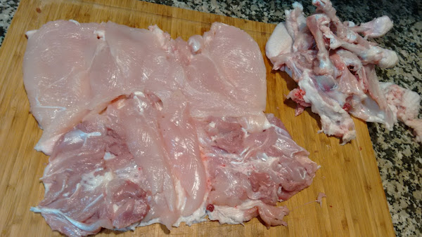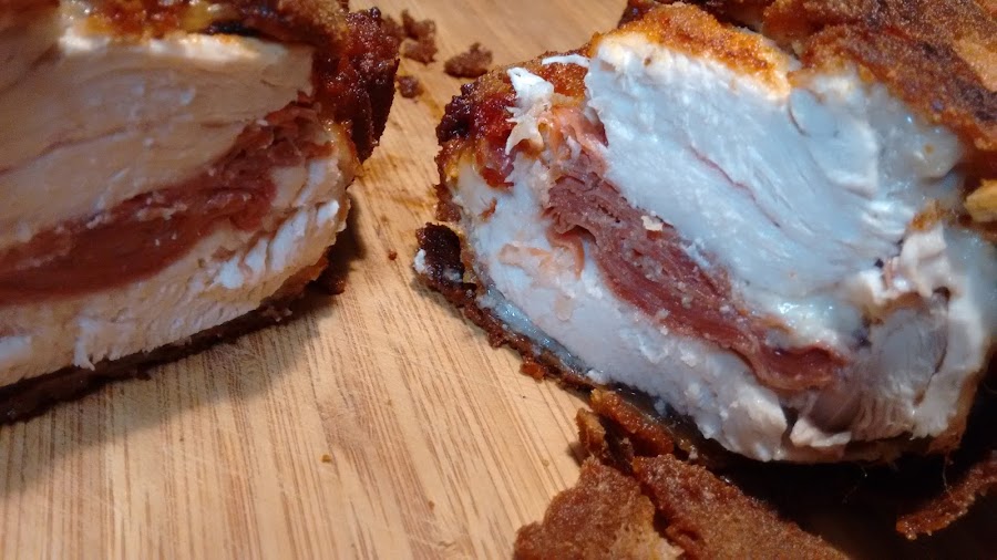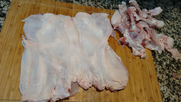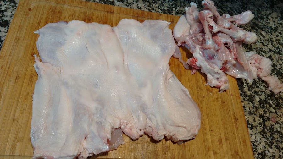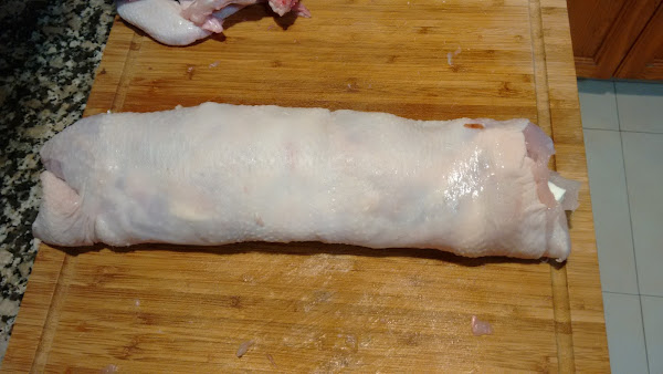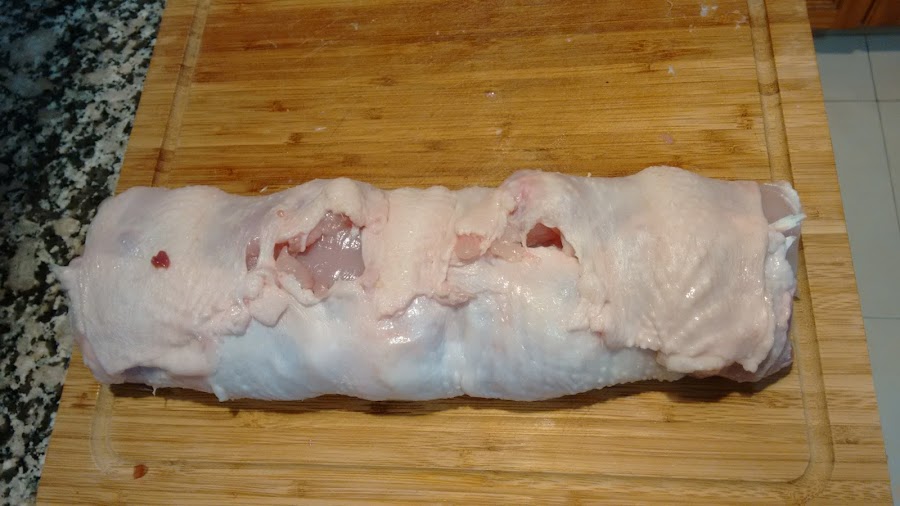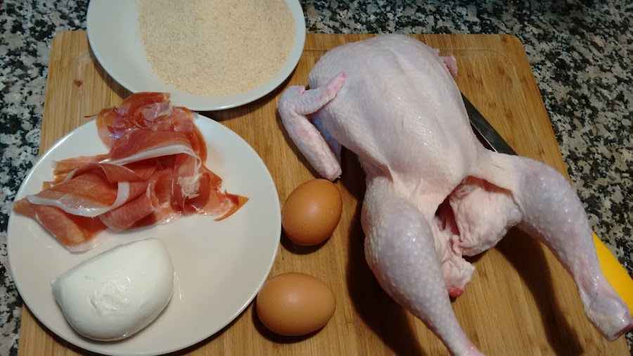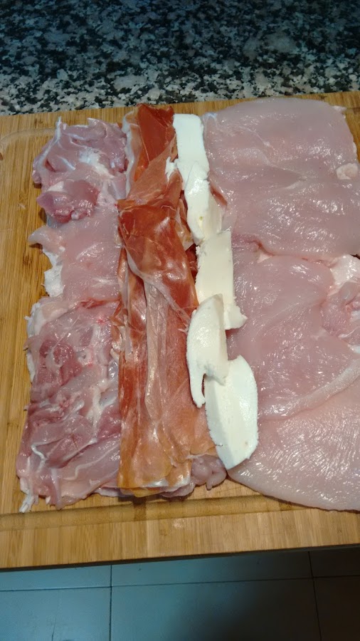 Lo ponemos con la piel para abajo y rellenamos con el jamón y la mozzarella.
