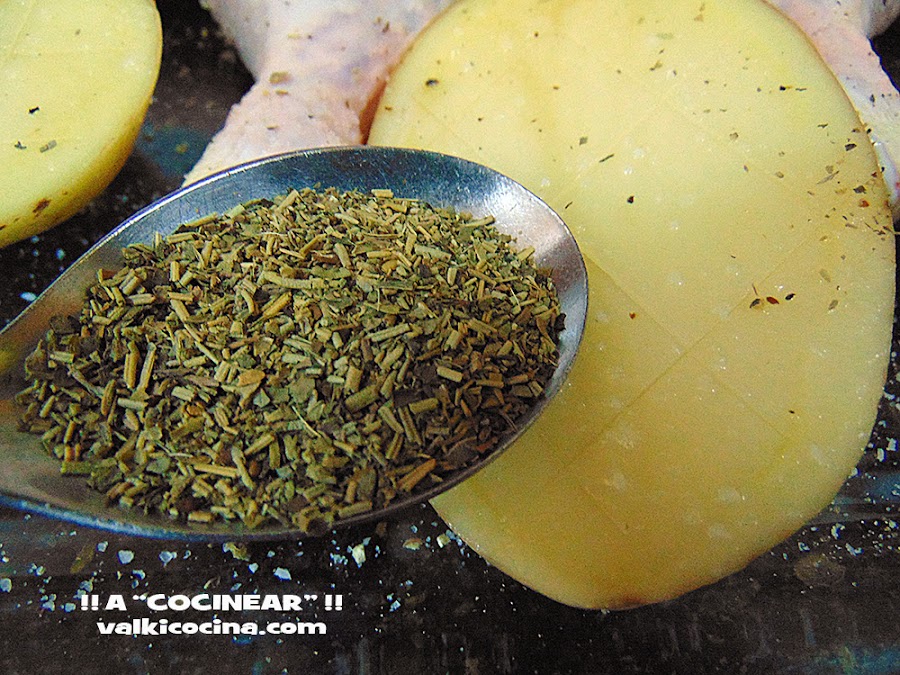 Esparcimos por encima las hierbas provenzales y vertemos un fino hilo de aceite por arriba. Podemos embadurnar bien todo con las manos para que se reparta por todas partes.