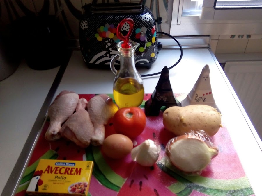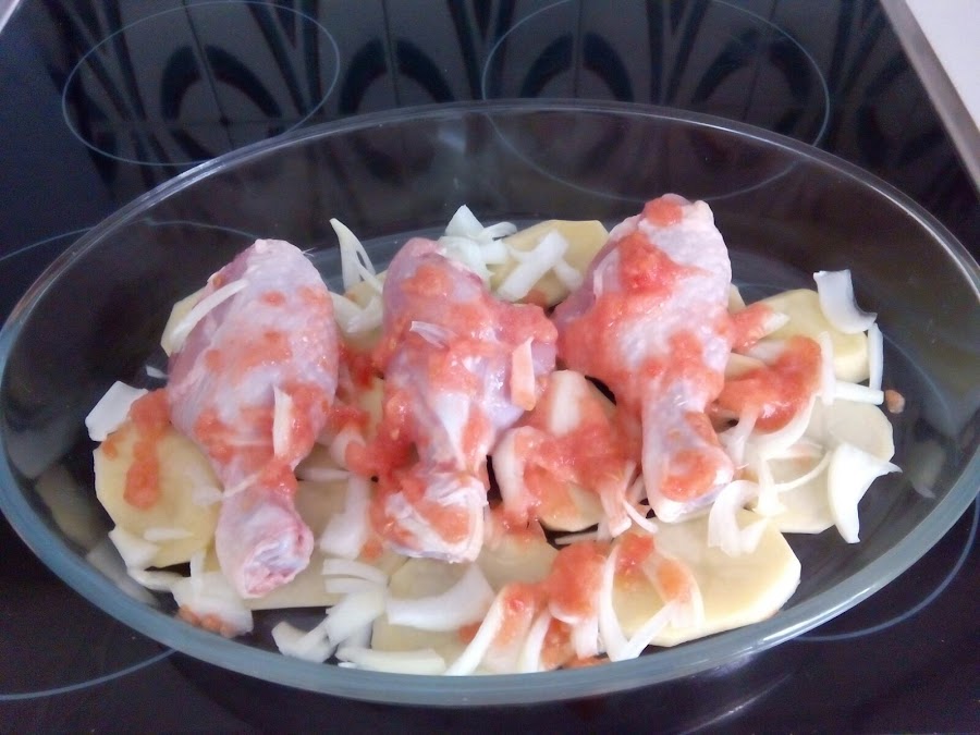 Limpiamos los muslos de pollo y sal pimentamos. Rallamos los tomates, cortamos la cebolla y pelamos y troceamos las patatas.