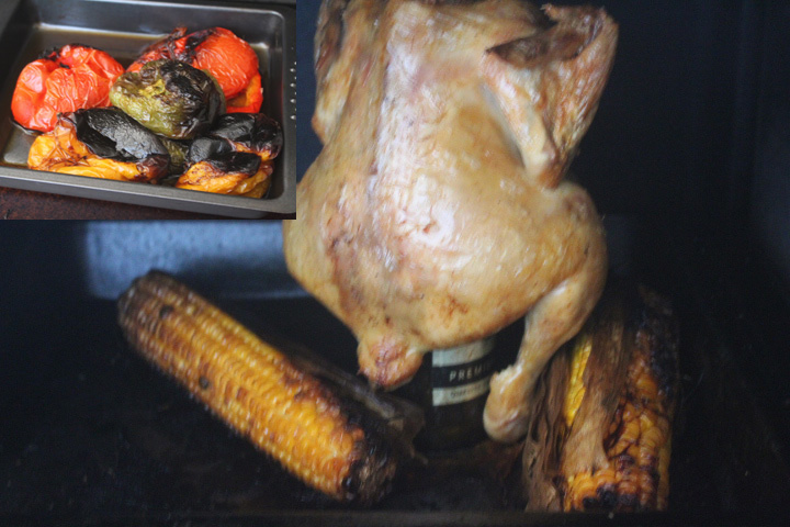 En esta ocasión opte por acompañarlo de unos pimientos de colores y dos mazorcas de maíz, aunque en otras ocasiones lo he acompañado de patatas grandes, enteras, sin pelar.