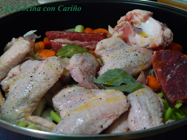 Mientras que terminamos la salsa, colocamos en una bandeja de horno el pollo con sal y pimienta, los ajos, el laurel, el vino y el agua, y un chorrito de aceite de oliva virgen extra. 50 minutos por cada lado y a 180ºC y luego ponemos el ventilador y subimos la temperatura a 200ºC y 15 minutos más por cada lado.