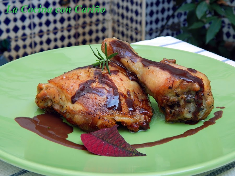 Presentamos el pollo y rociamos con su salsa y por encima, un hilo de salsa de chocolate, o un cucharón, como prefiráis. Espero que la disfrutéis.