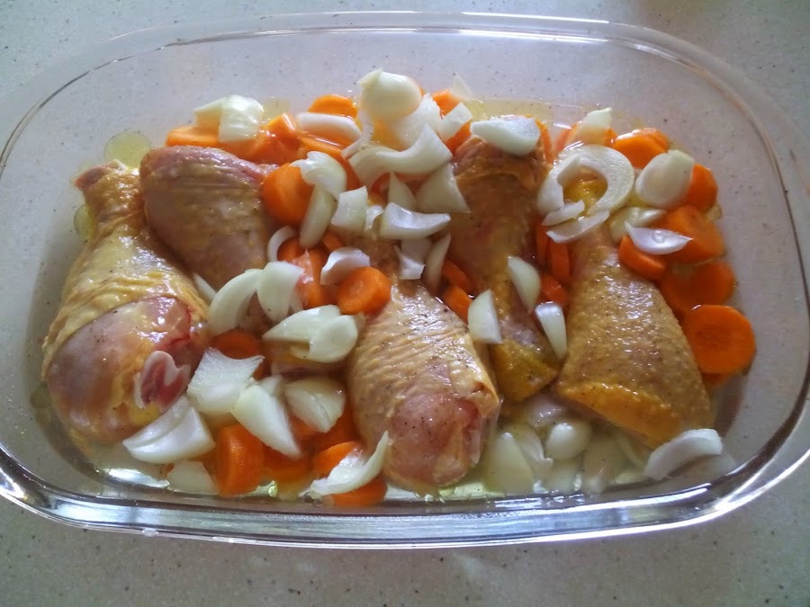 En una fuente poner el pollo, las zanahorias, la cebolla, 1/2 vaso de aceite, 1/2 vaso de vino blanco, un vaso de agua y sal.