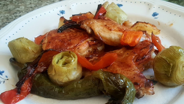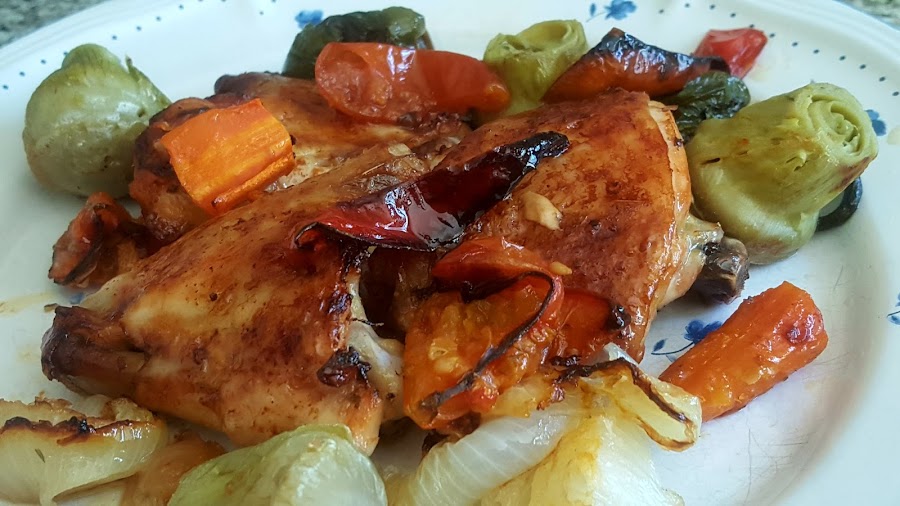 Untamos con aceite de oliva el fondo de una bandeja apta para el horno y vamos depositando en ella los muslos de pollo y todas las verduras, al azar.