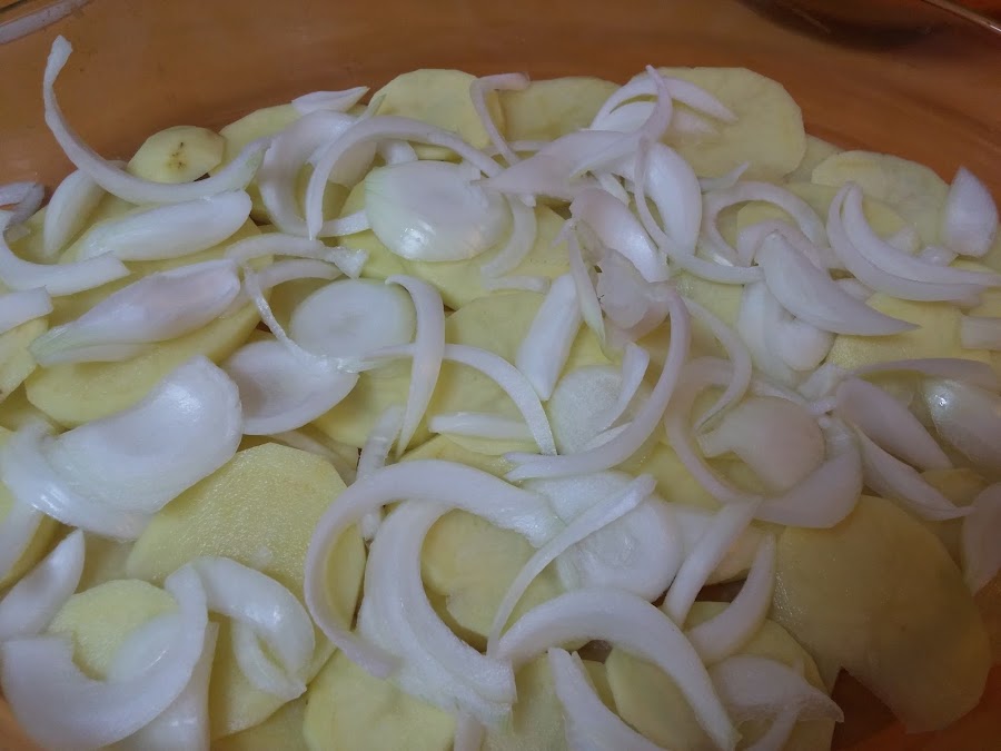 En una fuente apta para horno ponemos las patatas cortadas a rodajas.
