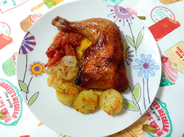 Cuando veas que empieza a dorarse el pollo, incorpora la cebolla cortada en juliana y el tomate cortado en rodajas. Ponlo al rededor del pollo y continua la cocción, procurando siempre que no quede seco, riega a cada poco. Yo lo que hago es que saco la cuajadera, y vuelco el jugo en el vaso y vuelvo a regar el pollo. Así me aseguro que siempre estará jugoso.