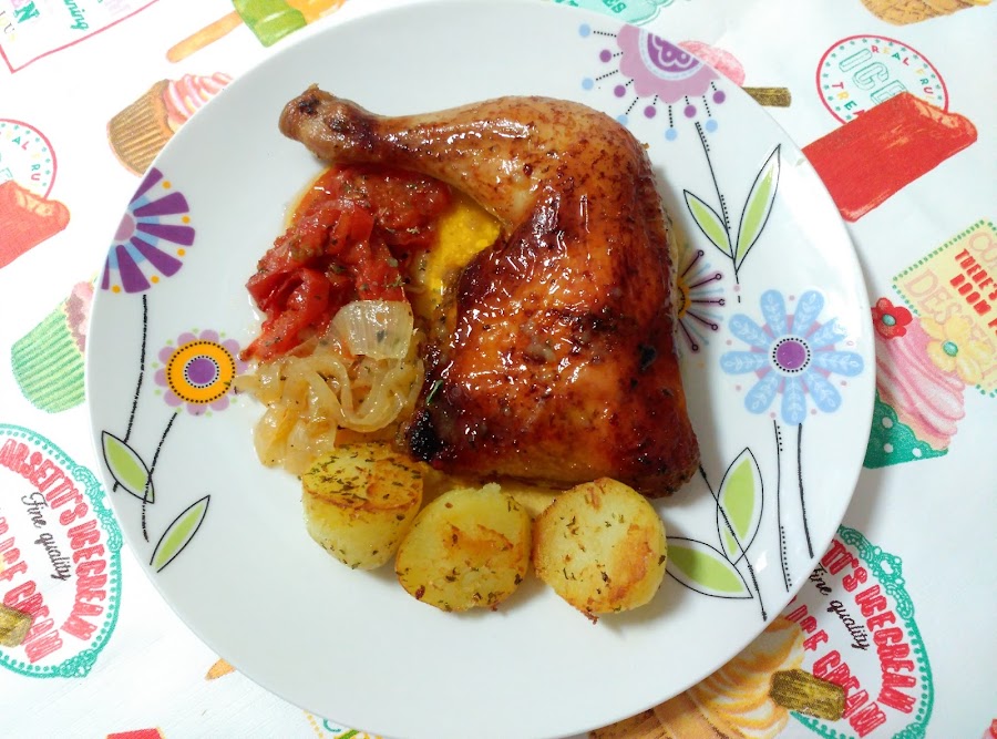 Riega con esta preparación el pollo e introdúcelo en el horno a 180º. Ve observando y de vez en cuando riega el pollo con el mismo jugo que va soltando. Procura siempre que no se quede seco, de ser así prepara mas salsa de la anterior y sigue regando.