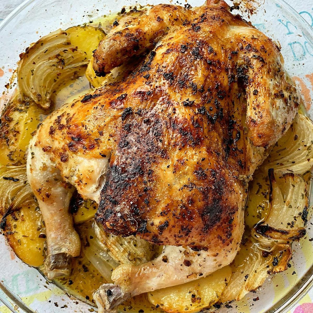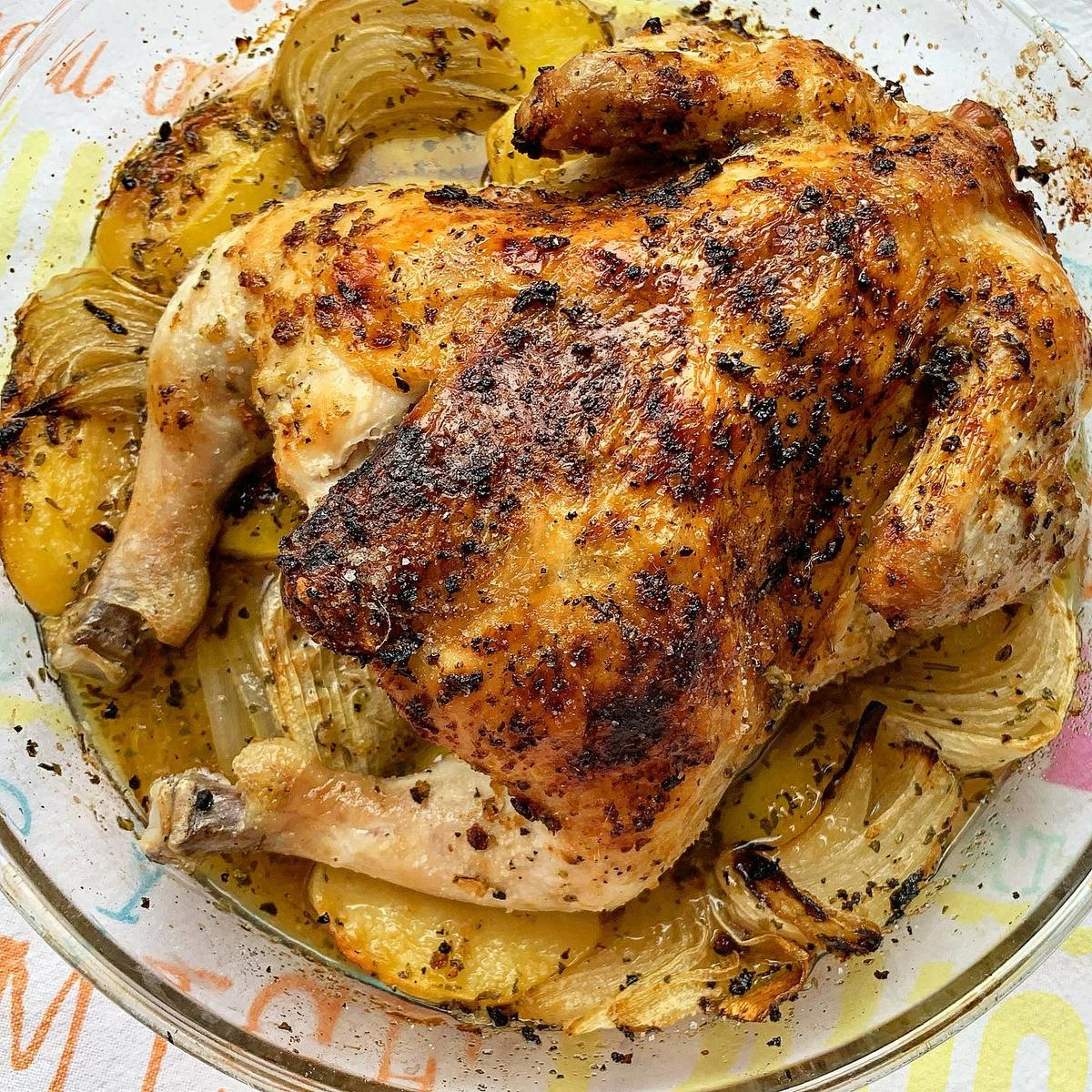 Horneamos durante los primeros 30 minutos a 210º. Pasado el tiempo, añadimos los trozos de cebolla y bajamos a 180º y lo horneamos +- 1 hora más. De vez en cuando vamos regando el pollo con el caldo de la bandeja.