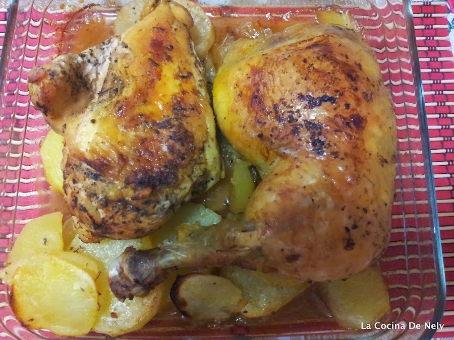 Ponemos un poco de aceite en la bandeja de horno para que no se peguen las patatas, ponemos encima las patatas y el pollo y encima una nuez de mantequilla y al horno hasta que la piel este bien dorada mas o menos 60 min a 190ºC.