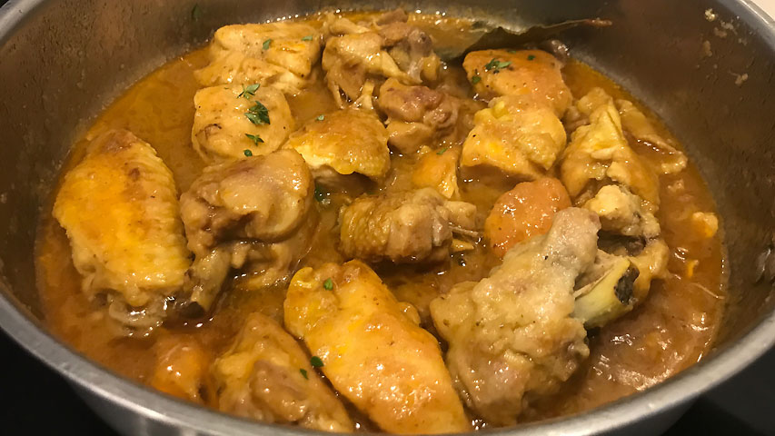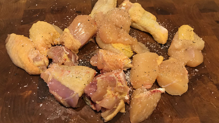 Yo he usado medio pollo troceado con sus huesos y su piel correspondiente. Podéis hacerlo más fácil con pechuga de pollo troceada sin piel ni nada.