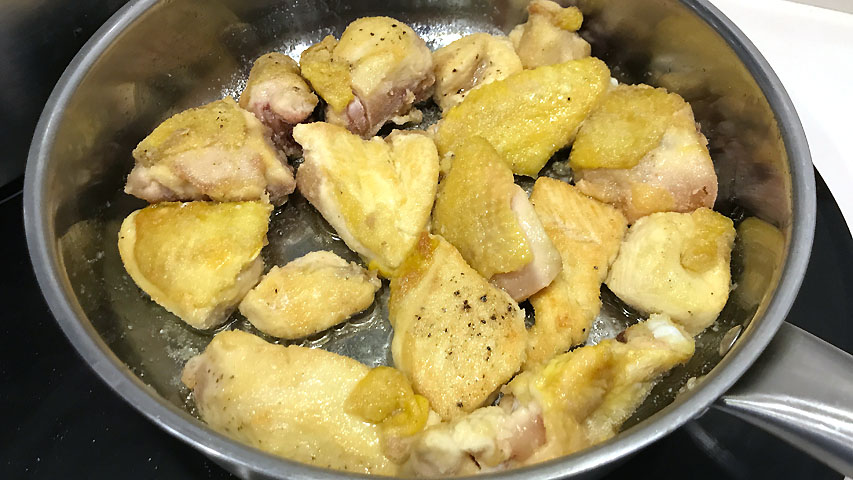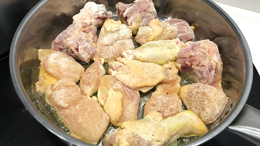 Prepara una cazuela a fuego medio y dora los trozos de pollo enharinados.