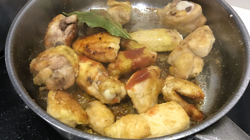 Una vez dorado el pollo añade el ketchup y la hoja de laurel.
