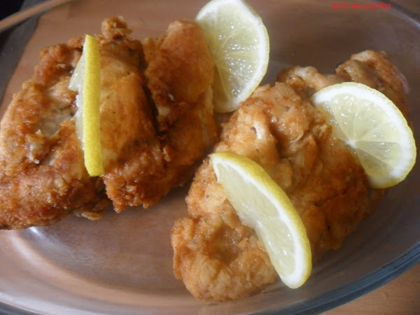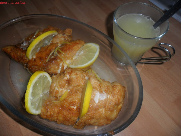 Las freímos en aceite caliente pero en su justa medida para que no se queden crudas por dentro las pechugas.La retiramos unos minutos sobre papel de cocina, cortamos a rodajas con un cuchillo bien afilado.Emplatamos en una fuente adornamos con las rodajas de limón y cubrimos con salsa bien caliente.El resto de salsa la ponemos aparte en una jarrita de servir .