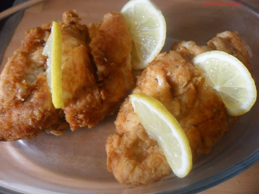 Ponemos una sartén con abundante aceite de girasol, vamos pasando las pechugas por la harina de maíz, sellamos por todas partes muy bien( es muy importante para que queden crujientes por fuera y jugosas por dentro.