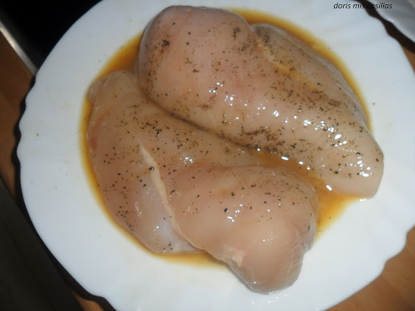 Salpimentamos las pechugas de pollo sin nada de grasa ni piel, las ponemos en un plato a macerar con los huevos batidos como una hora y pinchamos con un tenedor ligeramente..