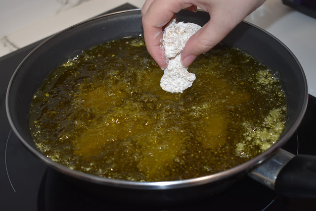 Una vez frito sacar y poner encima de un plato con papel absorbente y terminar de freír el resto del pollo.