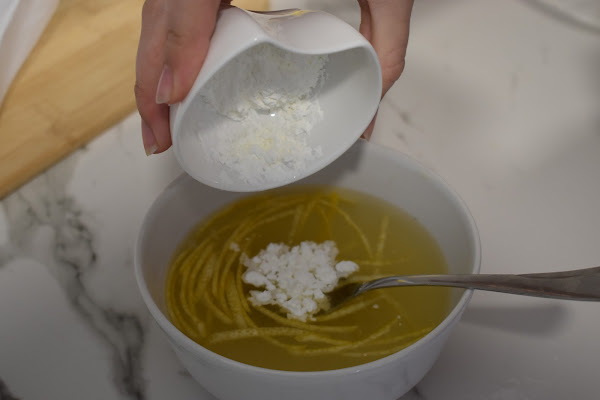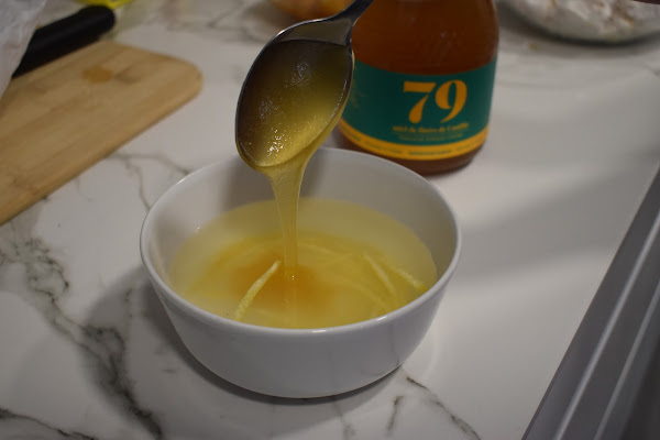 Ponemos en un recipiente el zumo y las tiras de piel del limón.