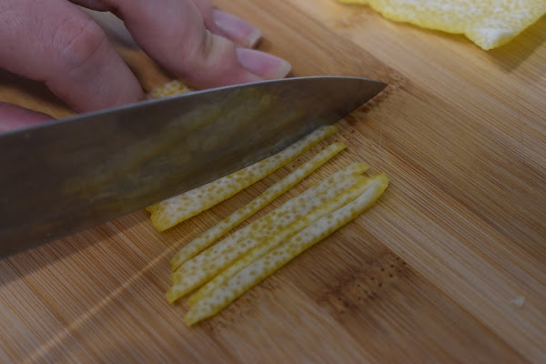 Pelamos la piel de limón sin nada de piel blanca "porque si no amargaría" lo troceamos en tiras muy finas.