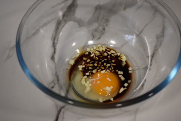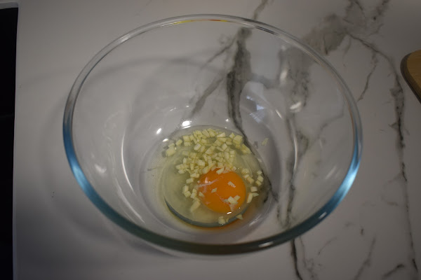 Ponemos en un bol el huevo, después pelamos y troceamos el ajo y lo añadimos.