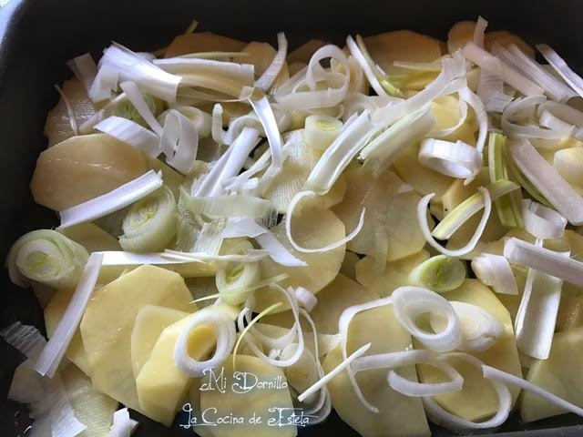 En una bandeja de horno ponemos aceite y las patatas cortadas en rodajas finas (Yo con mandolina), salamos y encima ponemos las cebolletas a rodajas también.