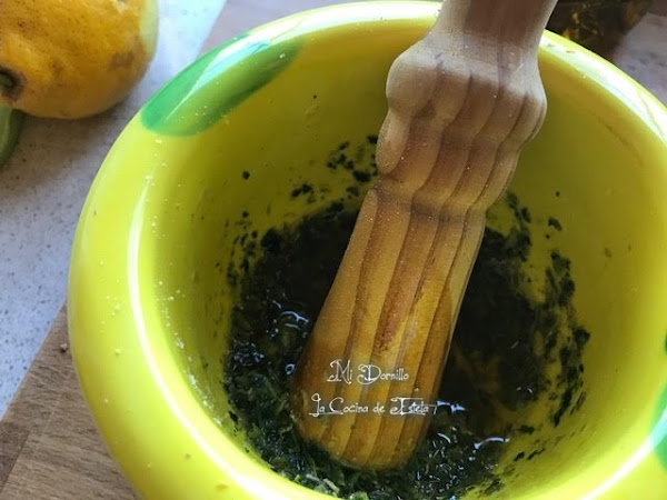 Hacemos un majado (o también podéis pasarlo todo por la batidora.) con los ajos el perejil, las ralladuras de limón, y una parte del romero y lo majamos o picamos todo muy bien. Añadimos una pizca de sal, el zumo de limón y un buen chorreón de aceite de oliva Virgen.