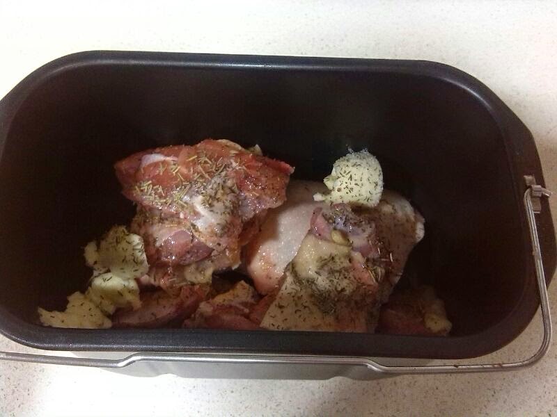 Salpimentáis el pollo, lo metéis todo sin CONTEMPLACIÓN en la panificadora o sea: pollo, dientes de ajo sin pelar, romero, tomillo, laurel.