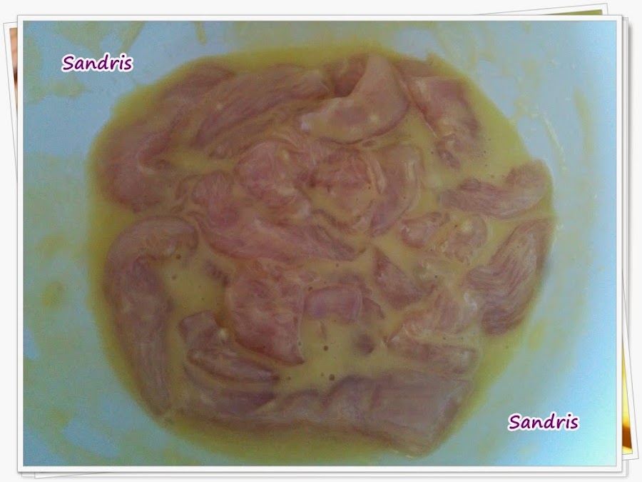 Y vamos al lío!!! Empezamos con el marinado... Cortamos las pechugas en tiras diagonales (o al gusto, vamos). Mezclamos por otra parte la clara de huevo, la fécula de maíz, la sal, el jengibre y a todo esto una vez mezclado, le añadimos la pechuga. Tenemos que dejarlo marinar en la nevera unos 30 minutos.
