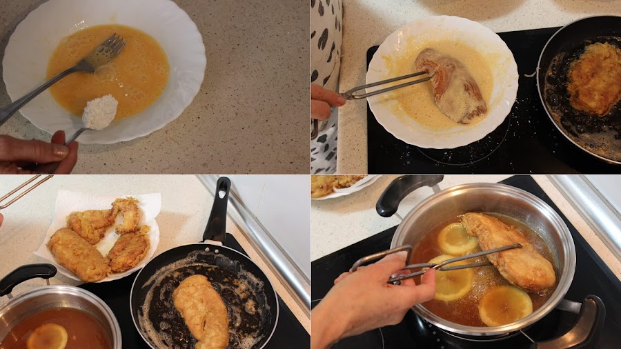 Mientras freímos los filetes, mezclamos los huevos con la maizena y la levadura. Sacamos los filetes del marinado y los pasamos por la mezcla de huevos y harina, los freímos en aceite bien caliente.