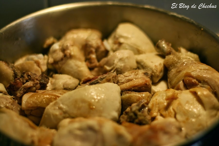 Lo primero que hacemos es poner a calentar el aceite en una cazuela. Cuando esté bien caliente añadiremos el pollo para que se dore.