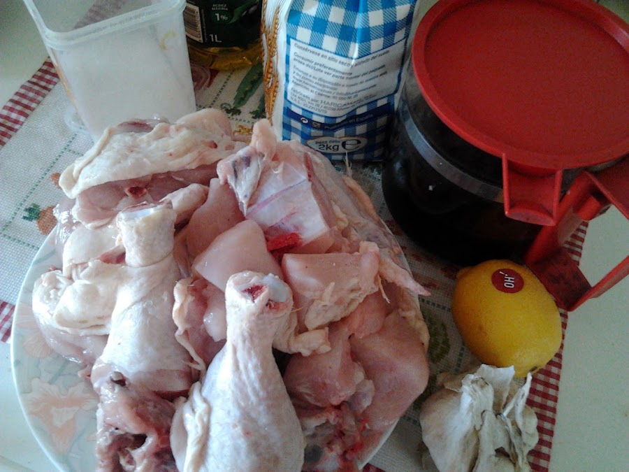Volvemos a añadir el pollo; le echamos dos cucharadas de harina y lo rehogamos bien. Lo salamos al gusto. Le incorporamos el zumo de los limones y cubrimos con agua.
