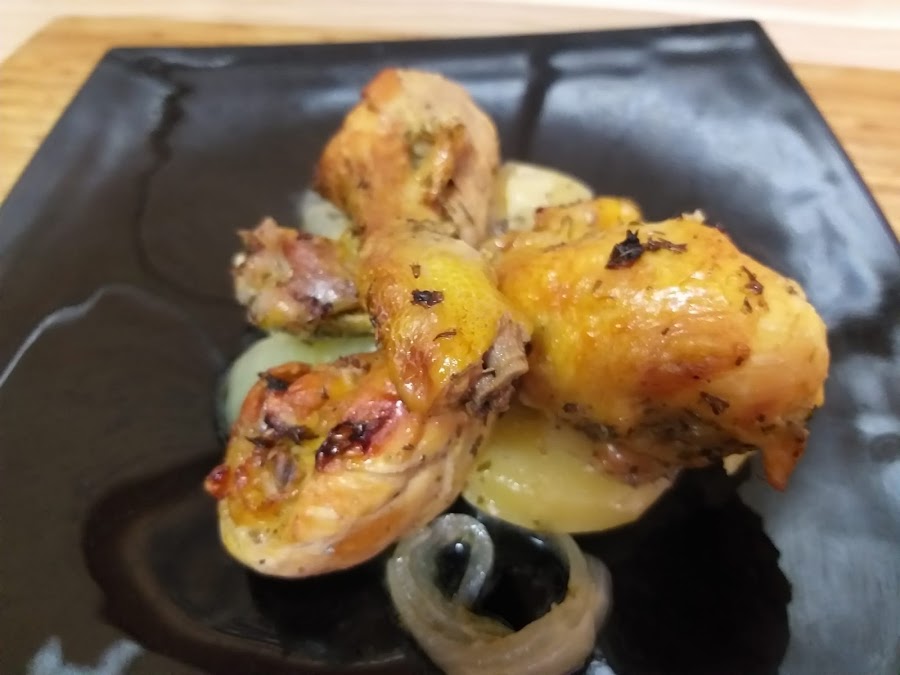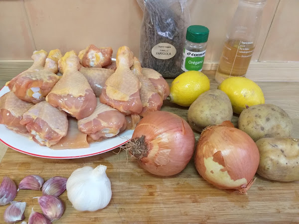 1 Pollo cortado a trozos (muslos mejor), 1 cebolla grande, 5 dientes de ajo, 1 patata grande, sal, zumo de 1 limón, 100 ml de vino blanco, 3 cucharadas grandes de aceite de oliva, 1 cucharadita de tomillo y 2 cucharaditas de orégano.