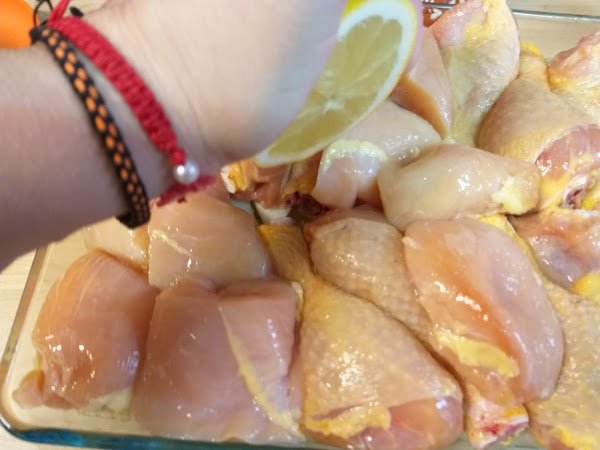 Colocamos encima el pollo y vertemos por encima el zumo de limón.