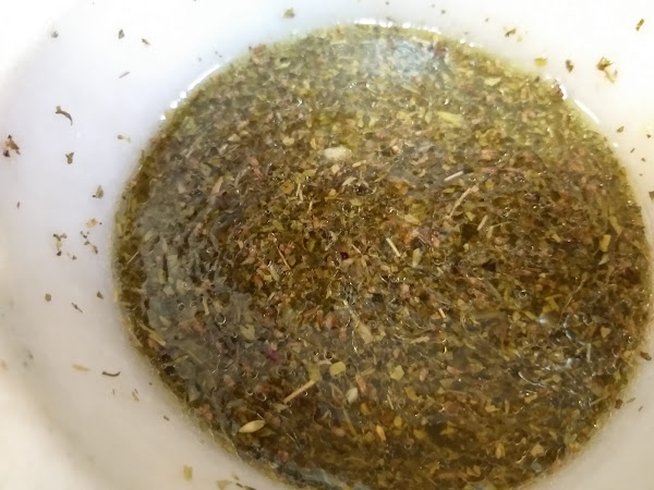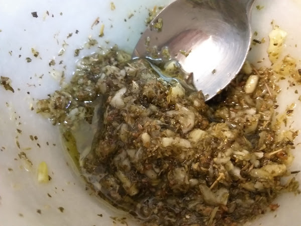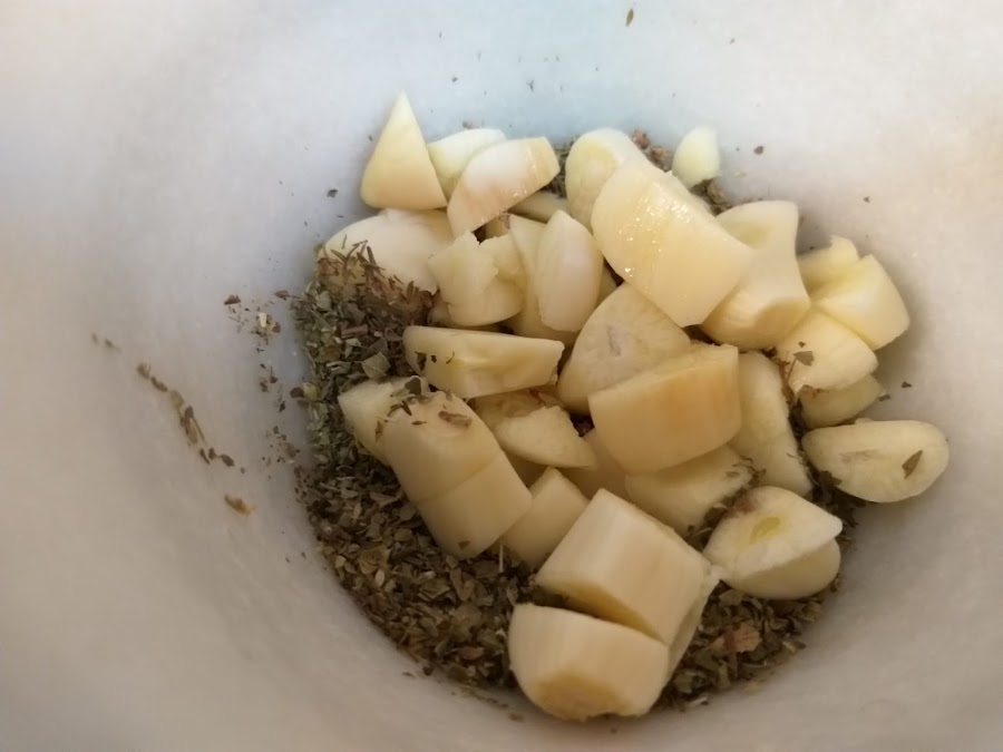 En el mortero majaremos el orégano, el tomillo y los 5 dientes de ajo.