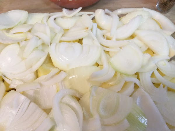 En una fuente para horno, echaremos un poco de aceite y colocaremos primero la patata cortada fina y encima la cebolla con un poco de sal.